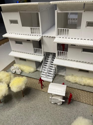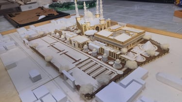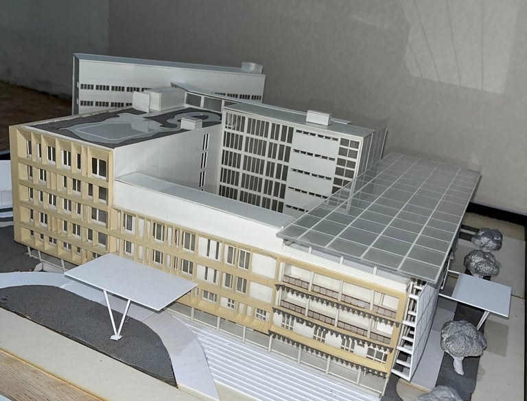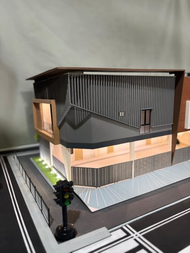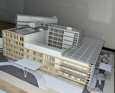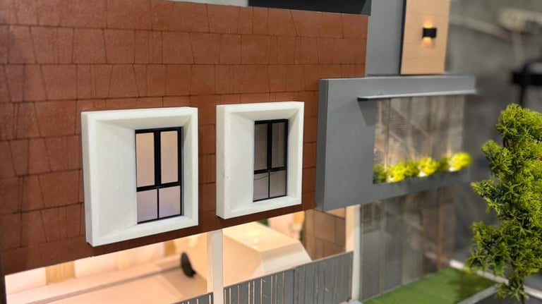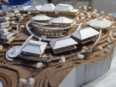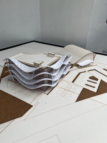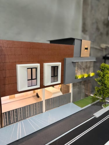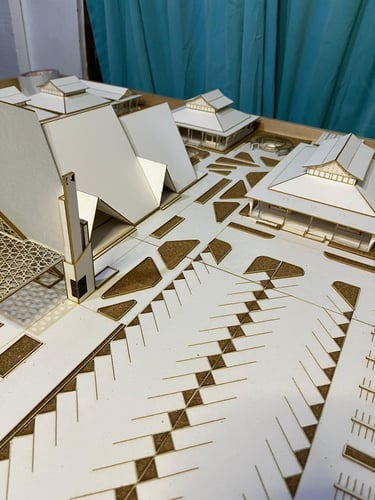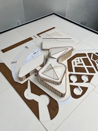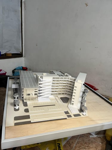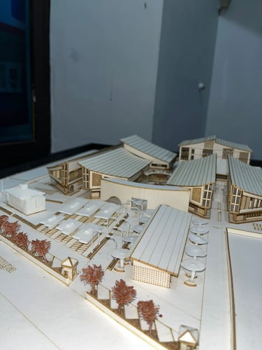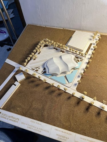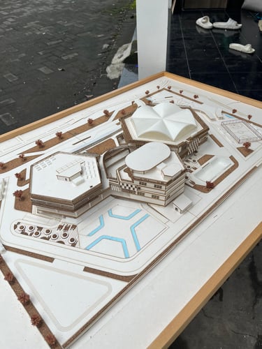 Maket Monokrom (Elegan, fokus pada bentuk dan massa bangunan).